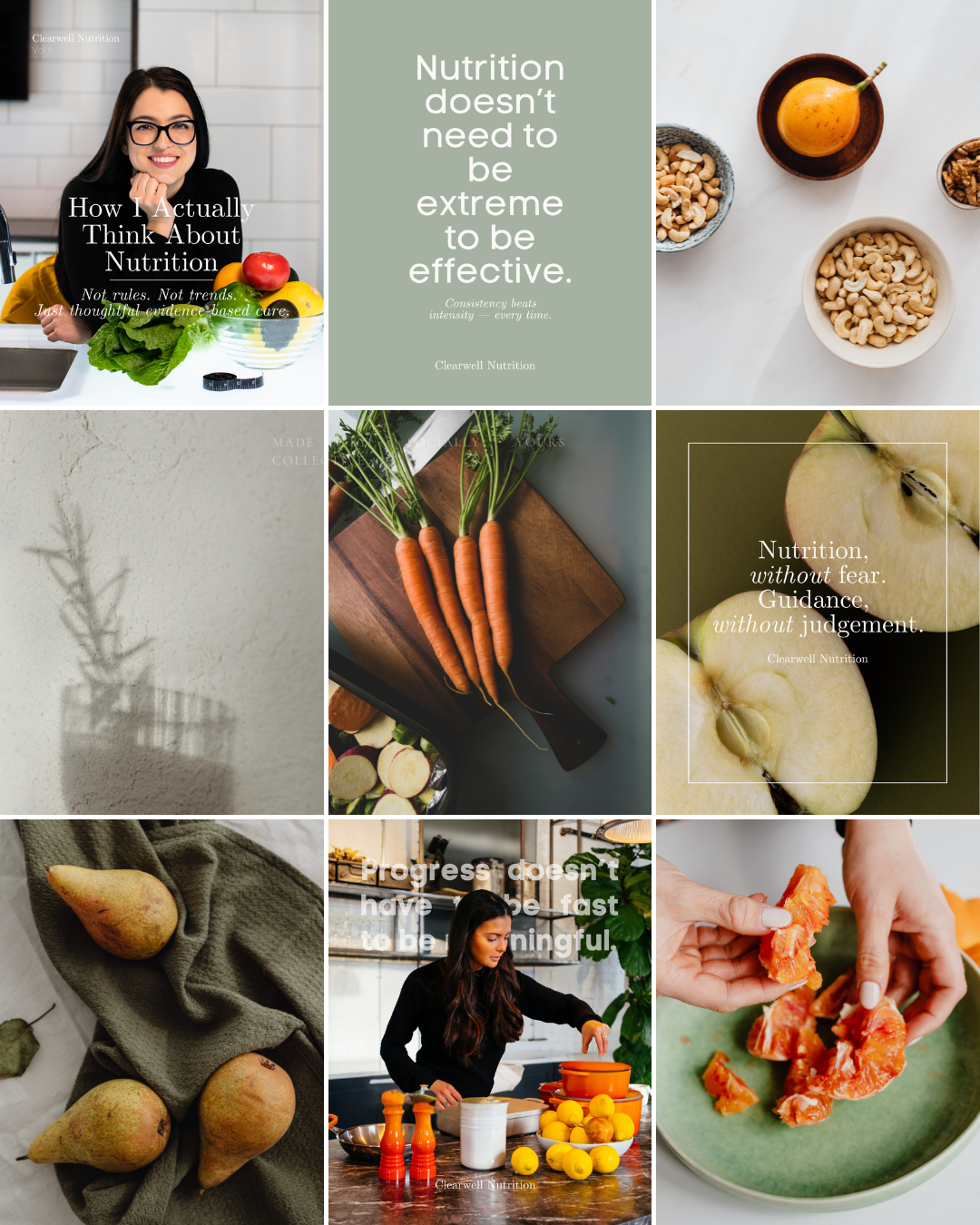 Clearwell Nutrition uses visual quiet as a strategic choice. By limiting contrast, exaggeration, and over-stimulation, the grid allows each message to land without triggering urgency or fear.